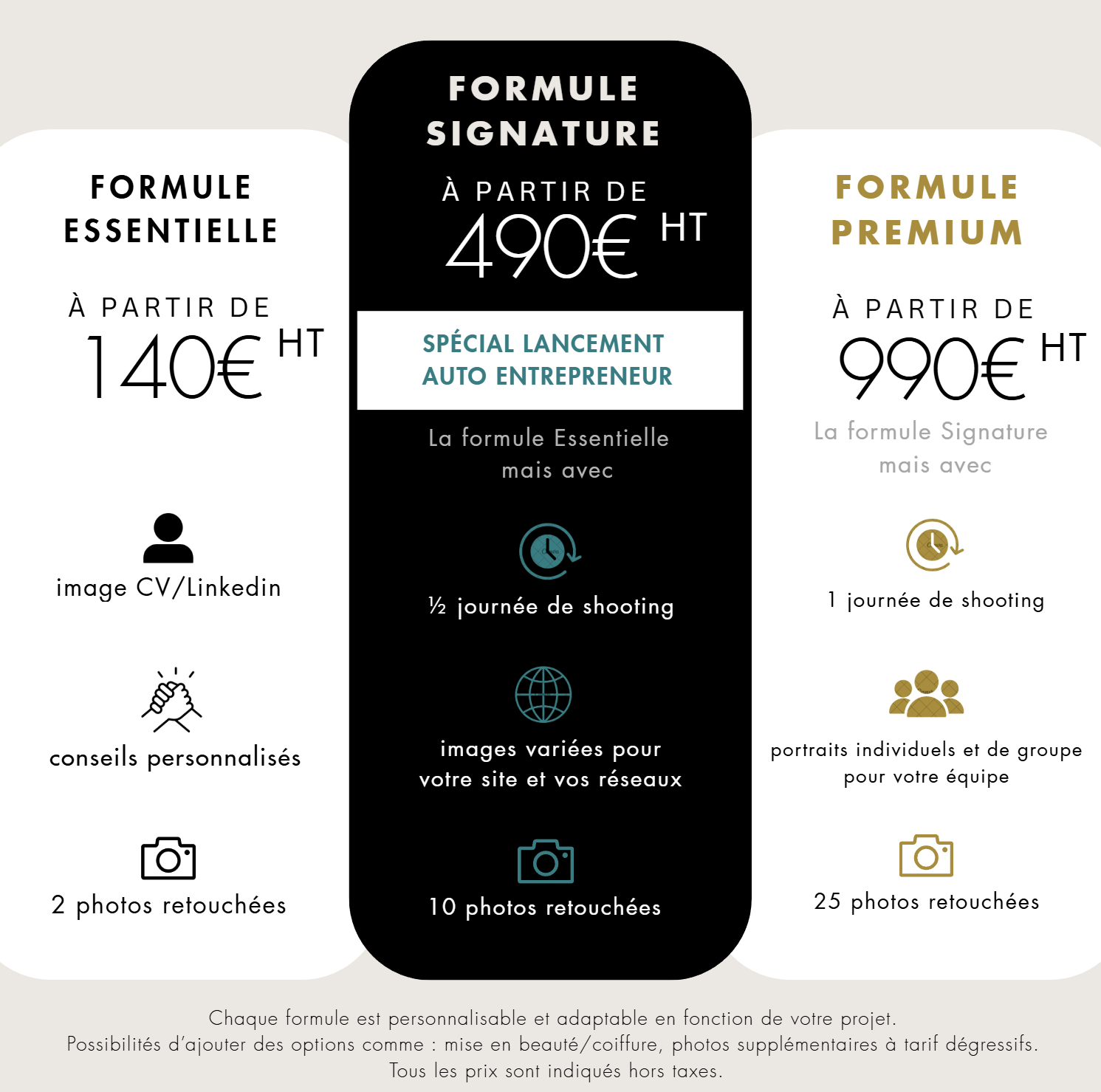 Vous pouvez ajouter des options comme une mise en beauté/coiffure ou des photos supplémentaires à tarif dégressif.